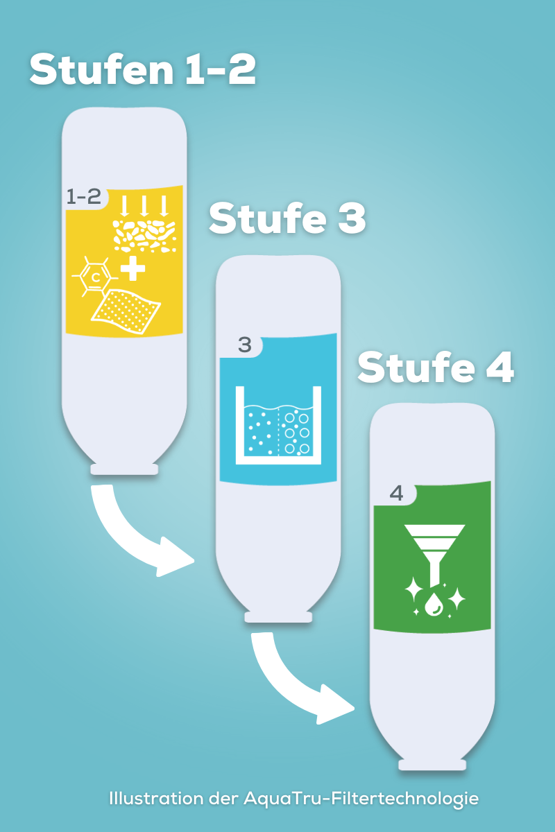 Umkehrosmose-Systeme sind darauf ausgelegt, Wasser gründlicher zu reinigen als Flaschenfilter. Im Vergleich zu anderen RO-Systemen geht AquaTru einen Schritt weiter mit seiner patentierten 4-Stufen-Technologie. Während andere RO-Systeme verschiedene Filterkombinationen verwenden können, ist der einzigartige Prozess von AquaTru darauf ausgelegt, die Schadstoffentfernung zu maximieren und gleichzeitig die einfache Nutzung zu Hause zu gewährleisten.