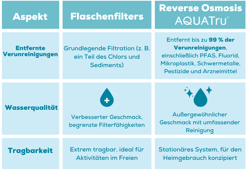 Egal, ob Sie sich für die Bequemlichkeit eines tragbaren Flaschenfilters oder die gründliche Reinigung eines fortschrittlichen Systems wie AquaTru entscheiden, das Ziel bleibt dasselbe: sauberes, sicheres Wasser für ein gesünderes Leben. Während beide Lösungen ihre Vorzüge haben, bietet die Investition in ein umfassenderes System Sicherheit, da sie gewährleistet, dass Ihr Wasser frei von einer breiten Palette von Schadstoffen ist.