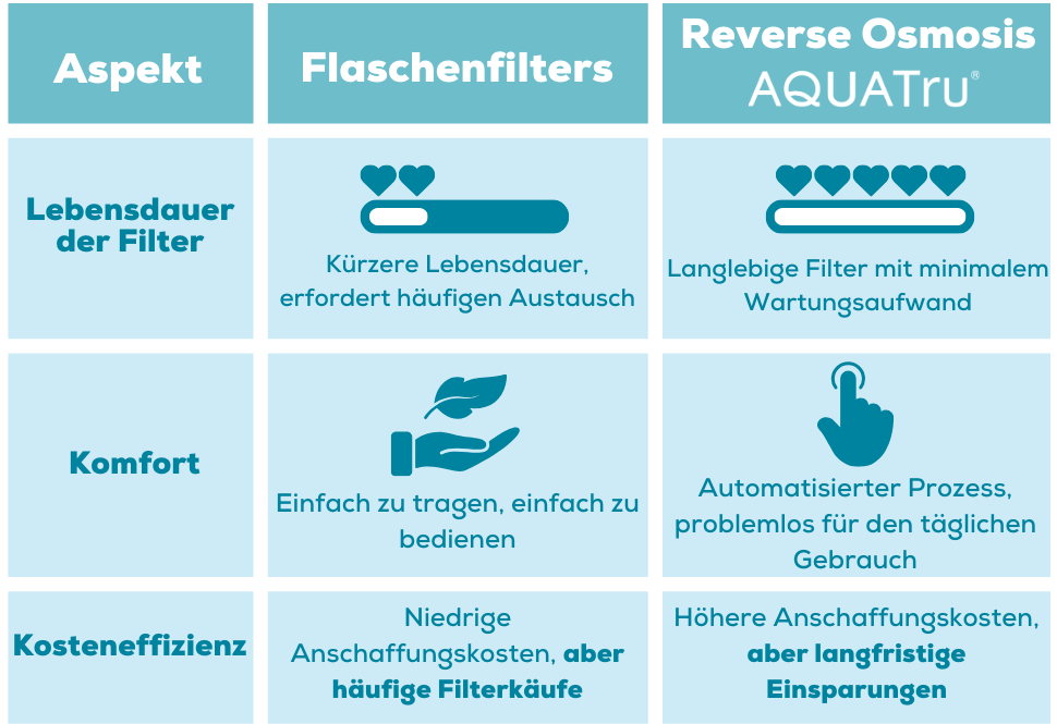 Beide Optionen haben ihre eigenen Vorteile. Flaschenfilter können nützlich sein, wenn du den Geschmack deines Wassers etwas verbessern möchtest und sofort Zugang zu saubererem Wasser haben willst. AquaTru hingegen bietet einen gründlicheren Filtrationsprozess mit weniger Aufwand und ist somit eine perfekte Ergänzung für deine tägliche Routine.