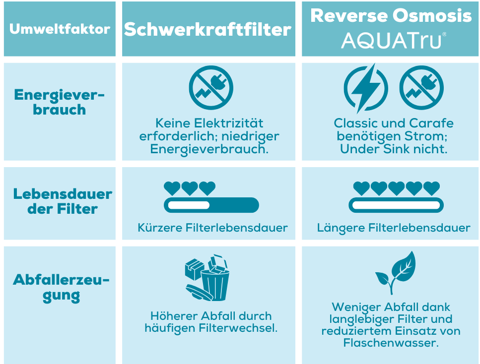 Schwerkraftfilter sind energieeffizient, tragen jedoch aufgrund ihrer kürzeren Filterlebensdauer stärker zur Abfallmenge bei. AquaTru-RO-Systeme benötigen zwar Strom, erzeugen jedoch langfristig weniger Abfall und tragen dazu bei, den Plastikmüll durch Flaschenwasser zu reduzieren.