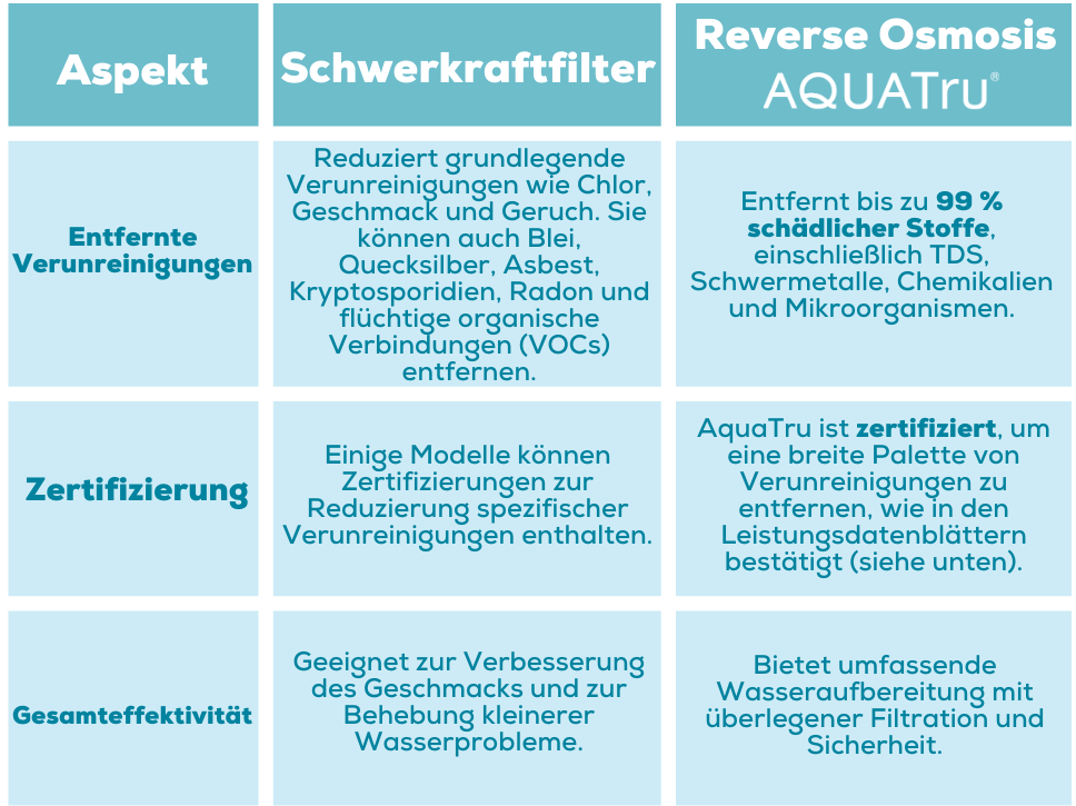 Schwerkraftfilter bieten eine grundlegende Filtration, indem sie Chlor reduzieren und den Geschmack sowie den Geruch des Wassers verbessern, sind jedoch weniger wirksam gegen schädlichere Verunreinigungen. Die Umkehrosmose-Technologie von AquaTru entfernt bis zu 99 % der schädlichen Substanzen und bietet eine weitaus effektivere Lösung, um sicherzustellen, dass Ihr Wasser sicher, sauber und rein ist.