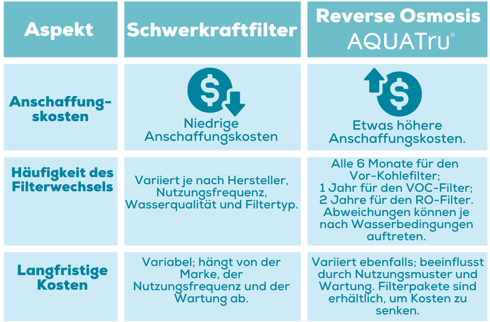 Schwerkraftfilter sind anfangs günstiger, aber die langfristigen Kosten können je nach Filterlebensdauer, Nutzungsfrequenz und Wasserqualität variieren. Im Gegensatz dazu haben Umkehrosmose-Systeme von AquaTru einen höheren Anschaffungspreis, können jedoch langfristig Einsparungen bringen, da sie durch verfügbare Filterpakete, effektive Leistung und Langlebigkeit überzeugen, wenn sie ordnungsgemäß verwendet und gewartet werden.