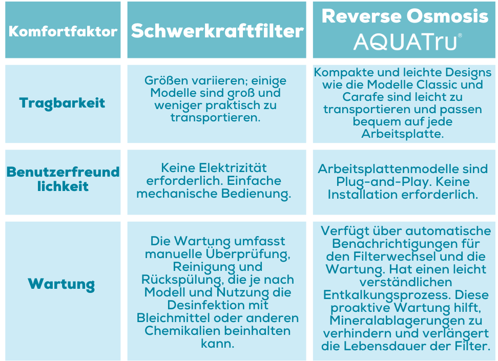 Bei der Auswahl eines Wasserfiltersystems ist es wichtig, neben der Filtrationseffizienz auch Faktoren wie Kosten, Umweltauswirkungen und Benutzerfreundlichkeit zu berücksichtigen. Nachfolgend finden Sie einen Vergleich zwischen Schwerkraftfiltern und Umkehrosmose-Systemen wie AquaTru, der diese wichtigen Aspekte hervorhebt und Ihnen bei Ihrer Entscheidung hilft.