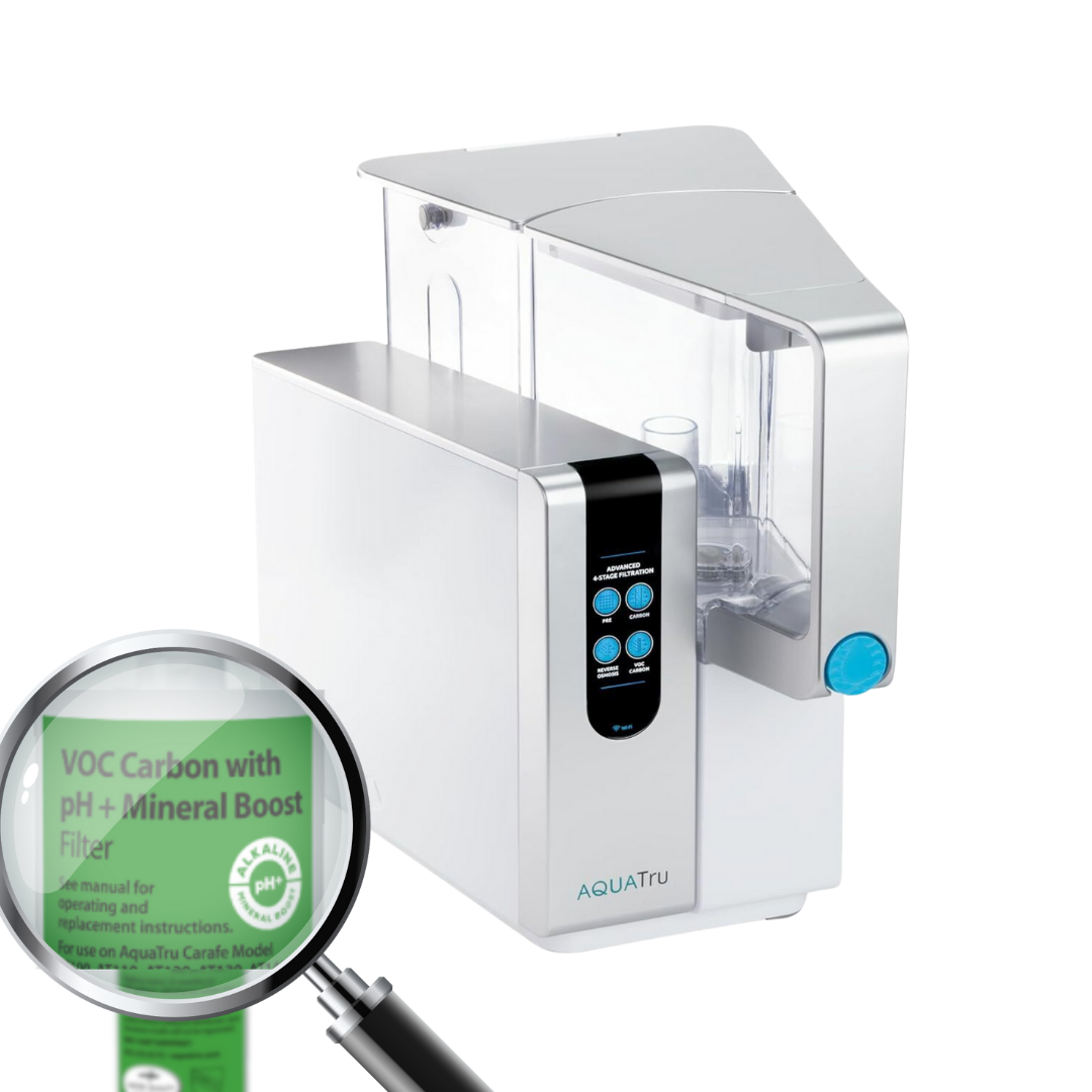 Das AquaTru Alkaline-Set kombiniert unseren fortschrittlichen vierstufigen Filterprozess, der bis zu 99 % der Schwermetalle, Arzneimittelrückstände, Mikroplastik und andere Verunreinigungen entfernt, mit einem Alkaline-VOC-Kohlefilter, der gesunde Mineralien wiederherstellt und den pH-Wert erhöht. Das Ergebnis ist sauberes, mineralreiches Wasser, das so gut schmeckt, wie es für Sie ist.
