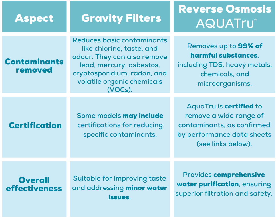 AquaTru's reverse osmosis systems go beyond the capabilities of gravity filters, offering a deeper clean with patented 4-stage technology. Unlike other reverse osmosis systems that may use varied combinations of filters, AquaTru's setup is optimised to remove contaminants while being easy to use at home.