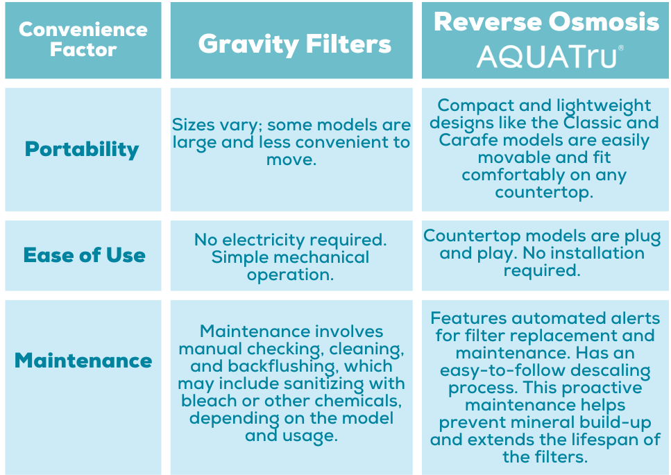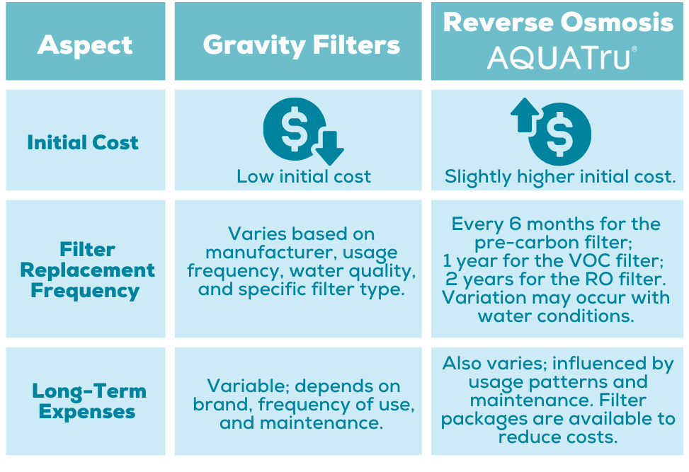 Choosing the right water filtration system involves more than just considering filtration efficiency. Factors like cost, environmental impact, and ease of use are equally important. Below is a comparison of gravity filters and reverse osmosis systems such as AquaTru, outlining these key factors to help you make an informed decision.