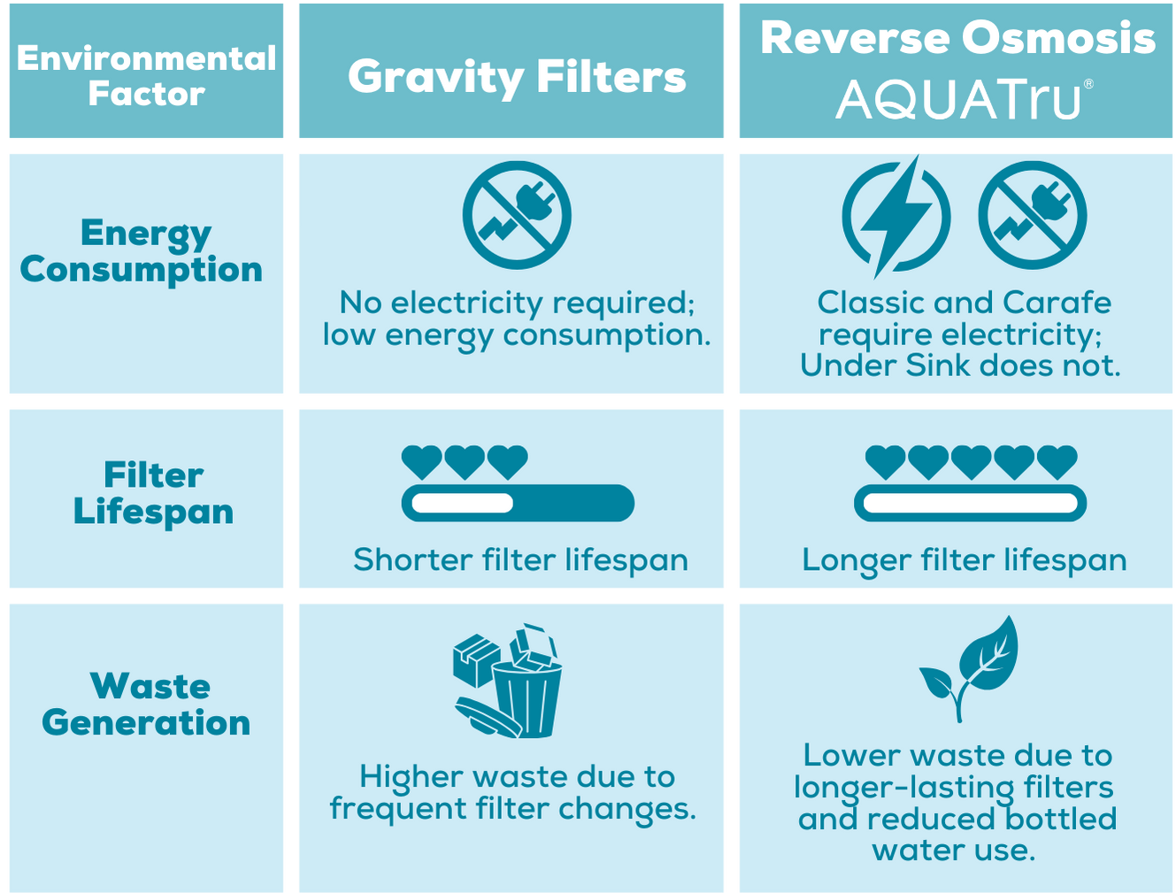 Gravity filters are energy-efficient but generate more waste because of their shorter filter lifespan. AquaTru systems, while using electricity, produce less waste in the long run and help reduce plastic waste by decreasing bottled water usage.