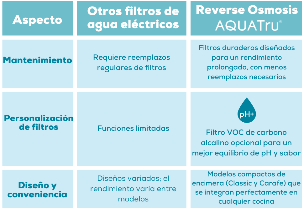 El sistema avanzado de ósmosis inversa de AquaTru ofrece una combinación equilibrada de eficiencia, filtración exhaustiva y facilidad de uso, lo que lo convierte en una opción destacada para quienes se toman en serio la calidad del agua. Otros filtros eléctricos pueden proporcionar soluciones rápidas, pero AquaTru garantiza que cada vaso sea lo más puro y seguro posible, con características adicionales que mejoran la experiencia general de beber agua.