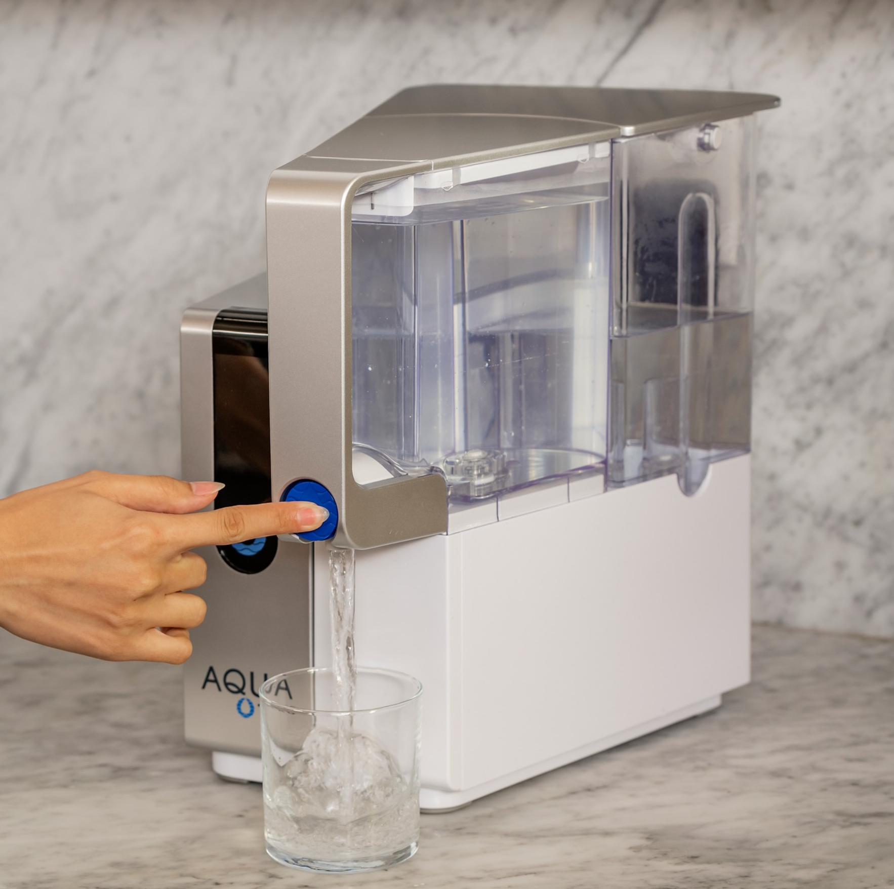 AquaTru Classic cuenta con una filtración de agua de 4 etapas basada en ósmosis inversa. El sistema es fácil de usar: tras instalar los filtros y conectarlos, llena el depósito trasero con agua del grifo y el sistema comenzará a filtrar de inmediato. En 12-15 minutos, el depósito delantero contendrá 2,7 litros de agua pura. Luego presiona el botón azul del dispensador en la parte frontal y coloca tu vaso debajo para obtener agua recién purificada. El depósito de agua filtrada es extraíble y puede guardarse en el refrigerador. Este depósito mide 19,69 cm de alto, 14,61 cm de ancho y 24,45 cm de profundidad. AquaTru Classic está hecho de plástico Tritan® duradero y libre de bisfenol A. El plástico Tritan también es conocido por no liberar microplásticos en el agua potable.