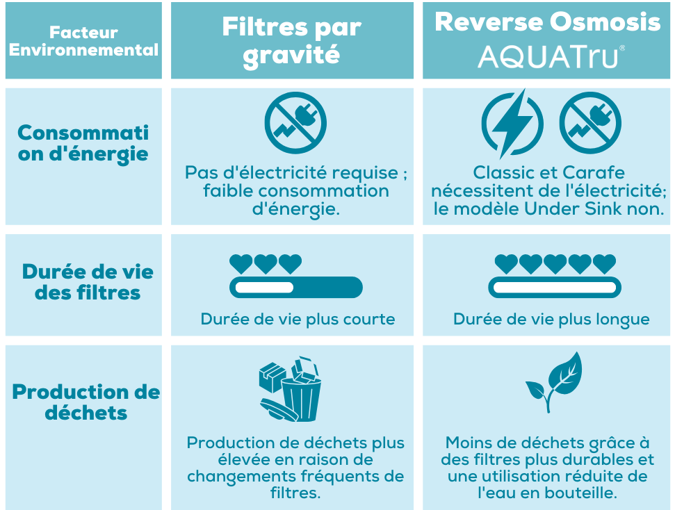 Les filtres à gravité sont économes en énergie mais contribuent davantage aux déchets en raison de leur durée de vie plus courte. Les systèmes AquaTru RO, bien qu'ils nécessitent de l'électricité, génèrent moins de déchets au fil du temps et contribuent à réduire les déchets plastiques provenant de l'eau en bouteille.