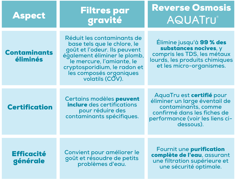 Les filtres à gravité assurent une filtration de base en réduisant le chlore et en améliorant le goût et l'odeur de l'eau, mais ils sont moins efficaces contre les contaminants plus nocifs. La technologie d'osmose inverse d'AquaTru élimine jusqu'à 99 % des substances nocives, offrant une solution beaucoup plus efficace pour garantir que votre eau est sûre, propre et pure.