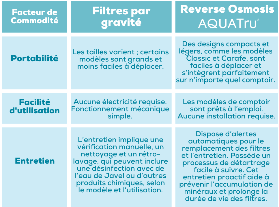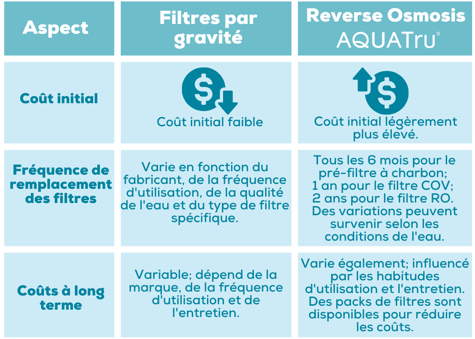 Lors de la sélection d’un système de filtration d’eau, il est important de prendre en compte des facteurs tels que le coût, l’impact environnemental et la commodité de l’utilisateur, en plus de l’efficacité de la filtration. Vous trouverez ci-dessous une comparaison des filtres gravitationnels et des systèmes d’osmose inverse comme AquaTru, mettant en évidence ces aspects clés pour guider votre décision.