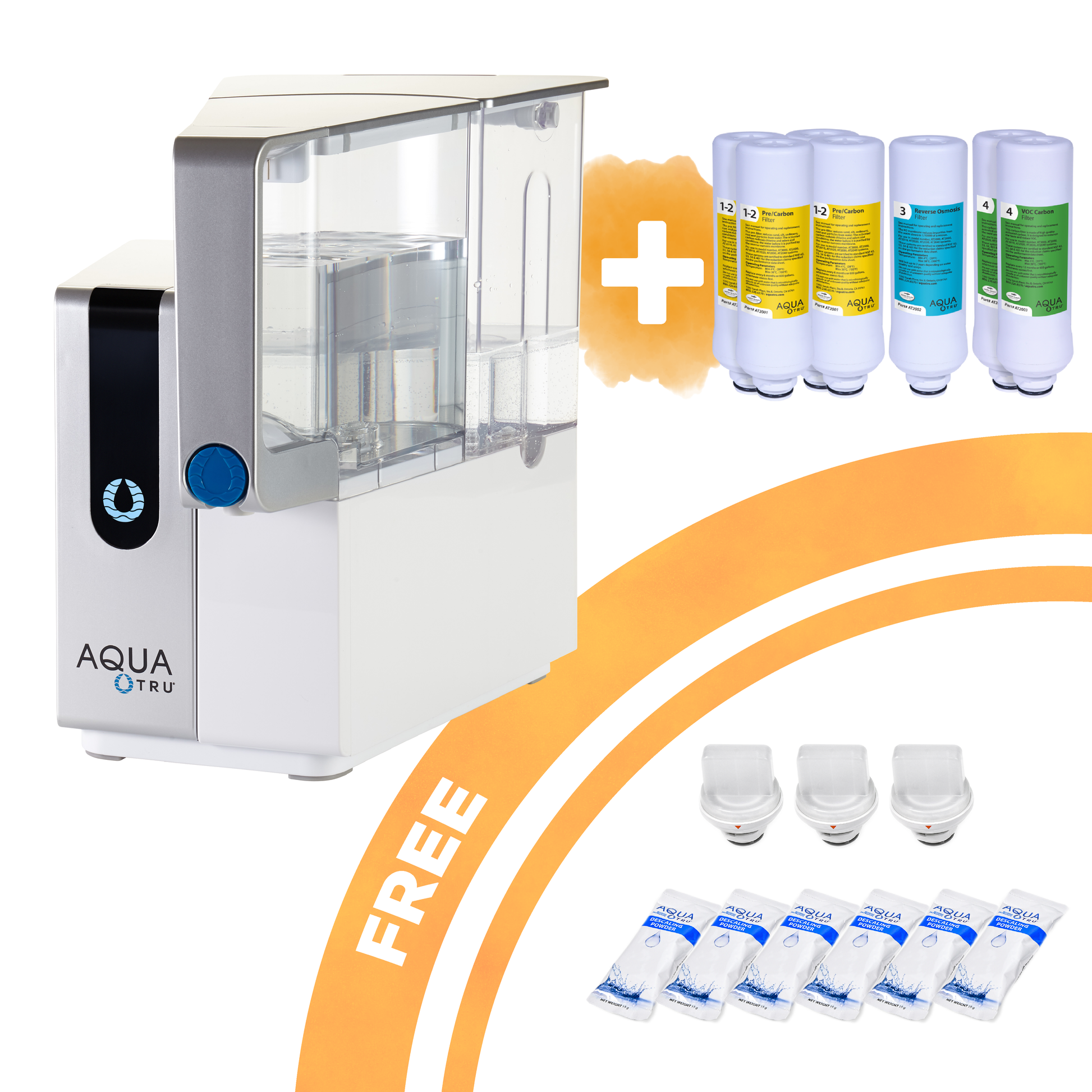 Si vous achetez ensemble le pack de filtres AquaTru Classic + 2 ans, vous recevrez un kit de détartrage gratuit. AquaTru Classic est un système complet de filtration d'eau basé sur Ultra Reverse Osmosis® qui élimine jusqu'à 99 % de tous les contaminants de l'eau du robinet. AquaTru Classic est facile à installer – Plug & Play – et facile à utiliser et à entretenir. Le système a une capacité de 2,7 litres et est idéal pour une utilisation fréquente à la maison ou au bureau.
